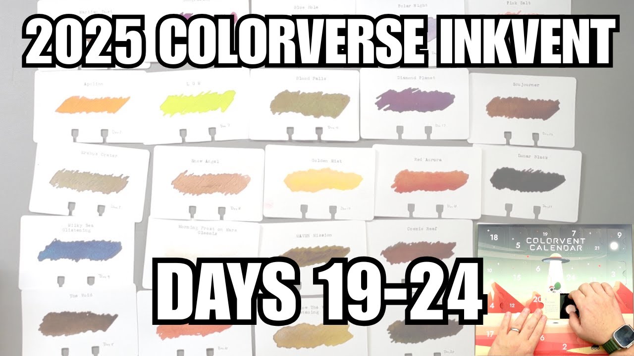 Join in as I unbox and explore days 19-24 of the 2025 Colorverse Inkvent calendar. In this video, I’ll be sharing my first impressions of these 6 days of inks and then taking a cohesive look at the entire 24 inks as as a whole. From creating ink swatches to exploring the different color exploration possibilities, I show the swatches on Col-O-Ring swatch cards and talk about the colors after they have had a chance to dry and reveal their true colors so to speak.